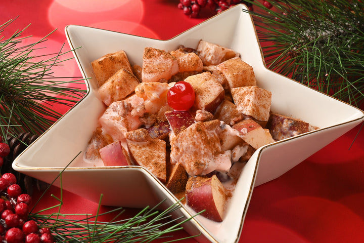 Ensalada de manzana navideña con durazno, piña, nuez y un toque de cereza.