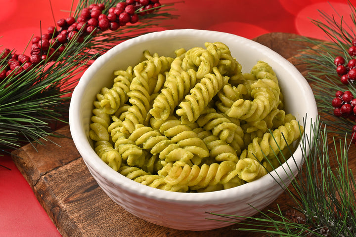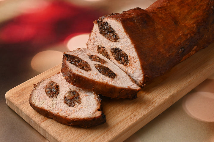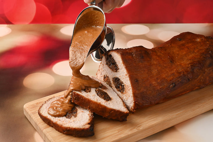 Delicioso lomo de cerdo mechado horneado en salsa de ciruela acompañado con gravy, puré de papa y camote con tocino y pasta fussilli en crema poblana, ¡Una gran combinación navideña con mucho sabor!