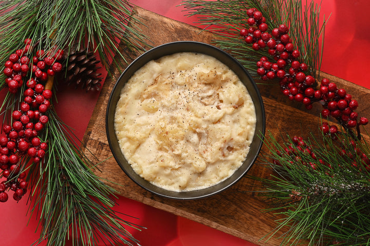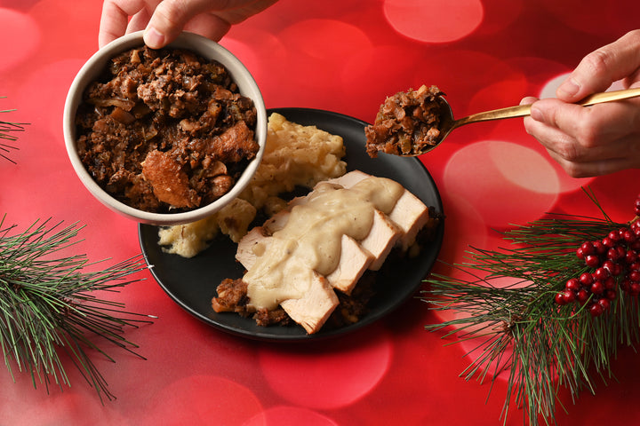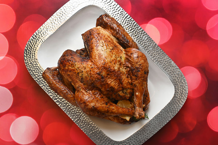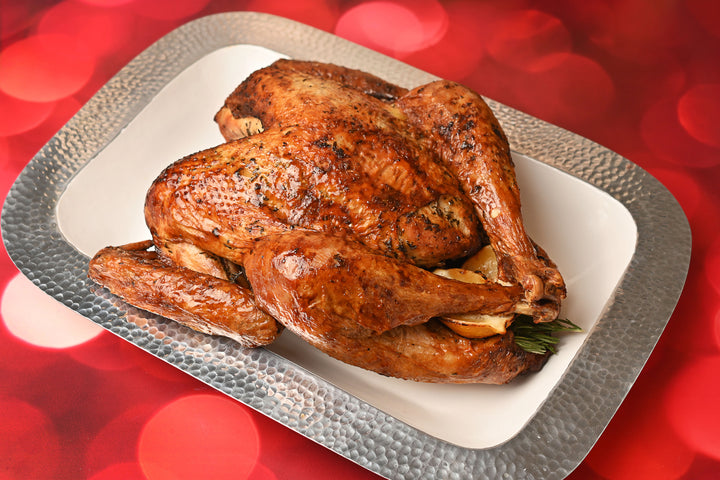 Jugoso pavo horneado en mantequilla con finas hierbas, acompañado de relleno navideño y un suave puré de papa rústico. ¡Un clásico de Navidad!